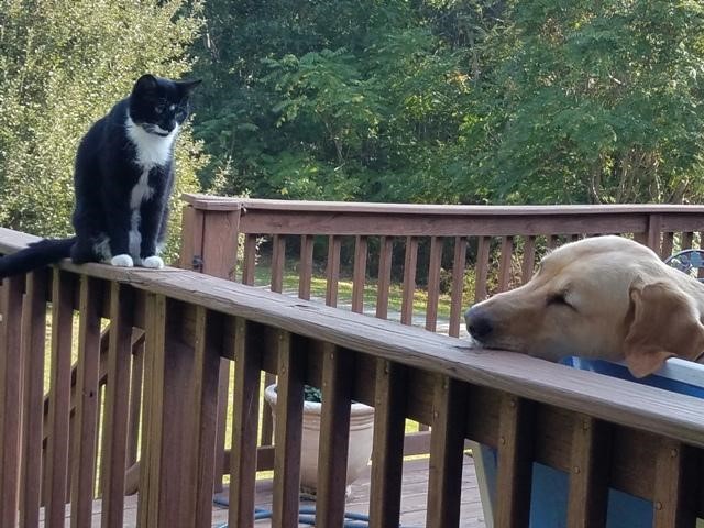 You hear stories about cats and dogs not getting along with each other, but Betsy and Mosby, my lab, are buddies.