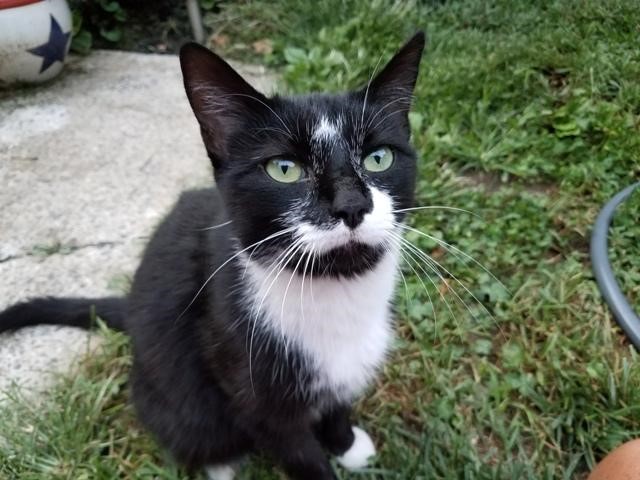 Miss Marilyn’s cat Jack had just died, and she was missing him pretty badly. So, we made a trip to the pound just to see what they had. We found a small, black and white kitty in one of the cages. We asked if we could pet her. When I took her out of the cage, she climbed up on my shoulders and wrapped herself around my neck. She didn’t want to get back in that cage. She won our hearts, and so home with us she came.